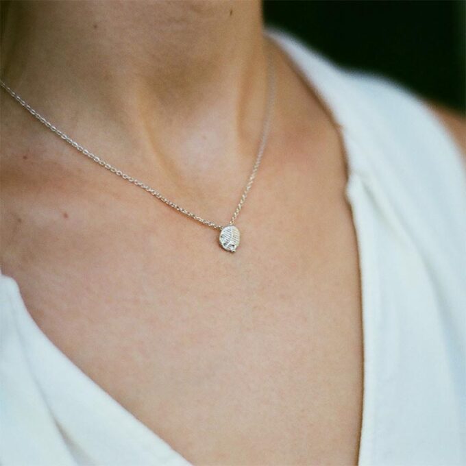 Set with organic grooves. This silver necklace features a distinctive pendant. Jewelry designer Ines Bouwen sought inspiration from details in nature and architectural forms, leading to the creation of this beautiful and subtle pendant. The pendant has small grooves reminiscent of an impression in soft ground, crafted with the skill of a sculptor. Being handmade and unique, this jewel by Ines Bouwen may vary slightly from the image.