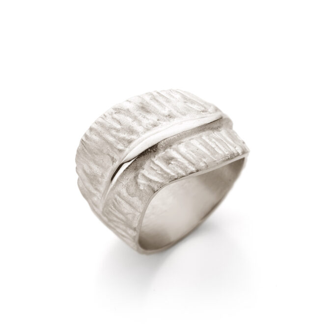The interior of the ring is carefully rounded for a smooth, comfortable fit, while the exterior texture invites touch and catches the light in ever-changing ways. Whether worn daily or reserved for special moments, this ring holds space for quiet elegance and individuality.