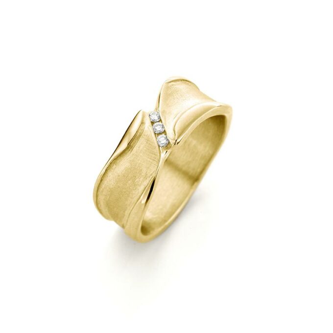 18kt gouden ring set met 3 diamanten. Dit juweel van Ines Bouwen is handgemaakt en uniek, het kan dus enigszins afwijken van de afbeelding.